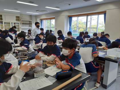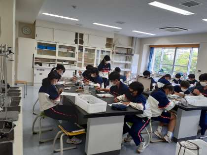 理科室では、連日のように実験が行われています。実験を終えて考察をまとめているところです。