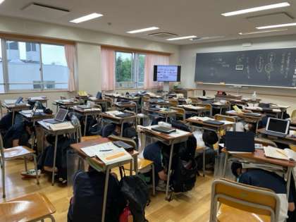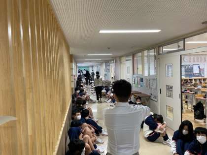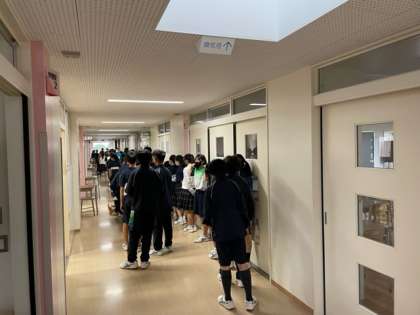 生憎の天気なので校庭避難はできず廊下避難となりました。