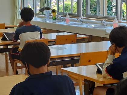 ランチルームでは、感染予防策を徹底し、大きく間隔を空けて保健係の会議が行われていました。体調管理は、宿泊行事で最も重要なこととなります。