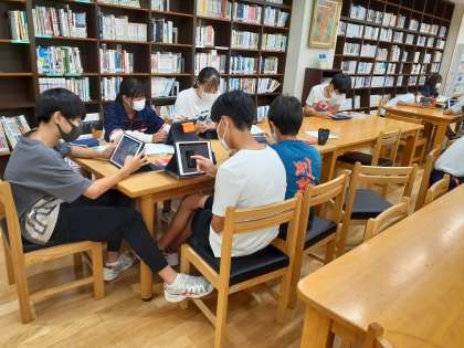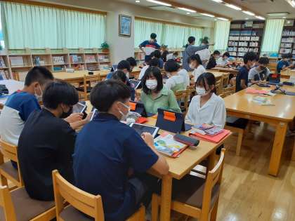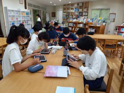 図書室では、2年生が、iPadを使って、班ごとに相談していました。プレゼン資料を和やかに作成していました。