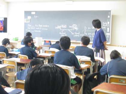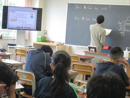 教室での英語の授業の様子です。デジタル教科書でリーディングの確認するように進行していました。