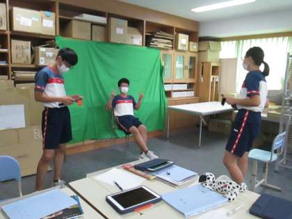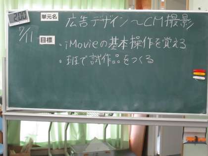 先週学んだiPadの中にあるツール、imovieを使って、映像作品の製作に取り組んでいます。題材テーマは「広告デザイン〜CM撮影」で、班ごとに相談を重ね、思い思いの場所で撮影し、グリーンカーテンの前でセリフを録画しています。