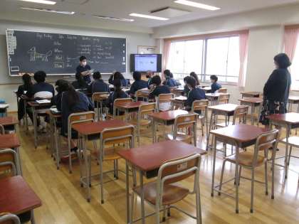 3年生は落ち着いた授業風景でしたが、1年生は活気ある元気な授業の様子をご覧いただくことができました。小学校3年生から英会話を学んで中学校に入学してくる現状で、英語教育は大きく変化しています。