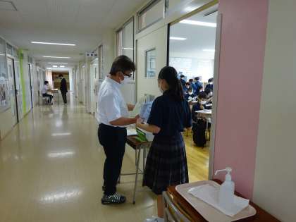 1年生は中学生になって初めての通知表です。担任の先生から頑張ったところや今後のアドバイスをもらい、ドキドキしながら受け取っていました。