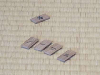3枚目の写真が、「雪月花」を行うための木札です。「花」がお点前を行い、「月」が正客、一の客、二の客・・・と役割を決めるくじとなっています。