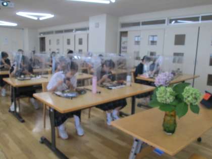 昼食は安全に最大限の配慮を行って、ランチルームでパーテーションを立てて黙食でいただきました。