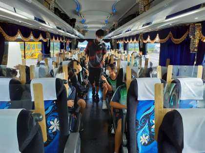 談合坂でのトイレ休憩を終えて、出発しました。車内では、点呼が終わっていて、担任が最終確認しています。