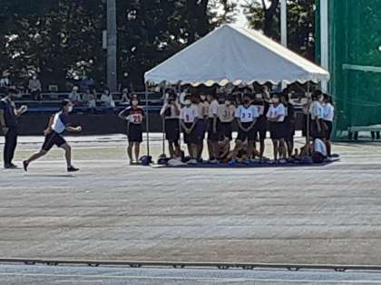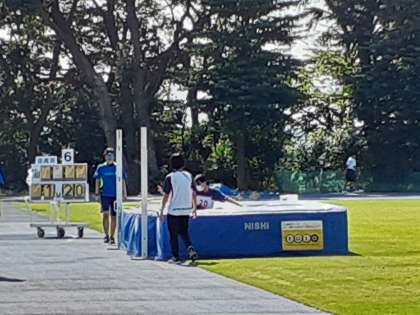 フィールドでは、女子走り高跳びが行われています。熱中症対策で、テントの中に待機しています。