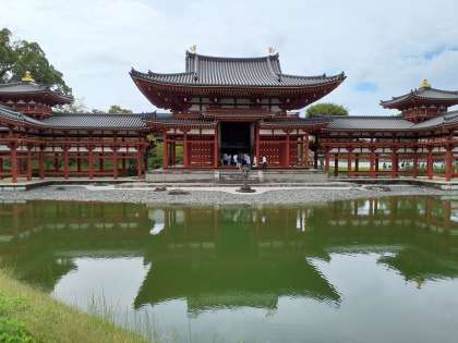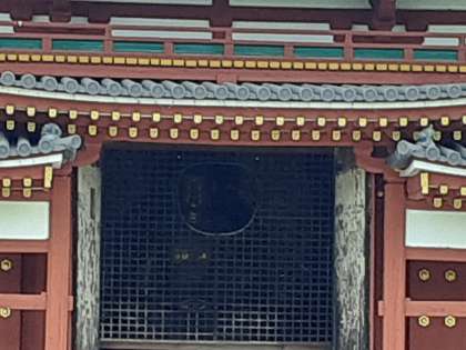 平等院の真正面にて鑑賞しています。真ん中の丸窓には阿弥陀如来像の顔があるはず。