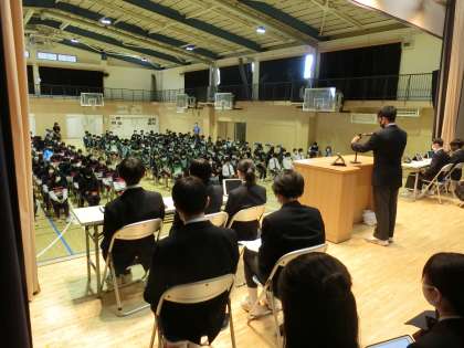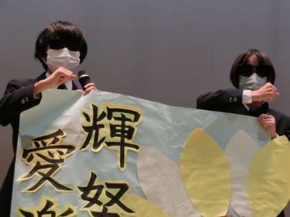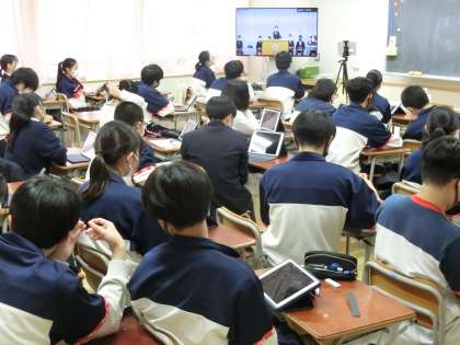 3年生会場中継(上)、専門委員長による活動方針報告・質疑応答(中)、学級委員による年間目標進捗状況報告(下)の様子です。