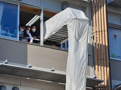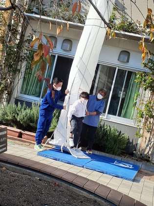 無事に1人目が降りてきました。先生方が裾を押さえているので安心です。