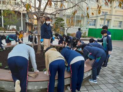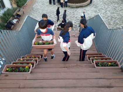 外階段へのプランター配置はなかなか大変な作業になりますが、2年生はたくさん参加してくれたので、サクサク作業が進みます。