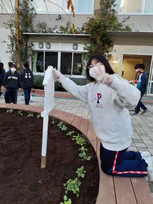 生徒会長が、立て札を花壇に立てています。今日の作業について、メッセージが掲げられることでしょう。生徒会の呼びかけに、大勢が参加してくれたので、作業がとてもはかどりました。