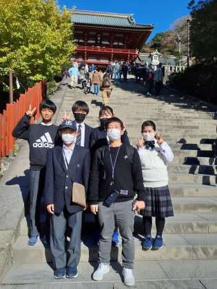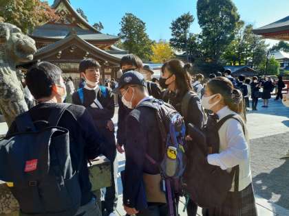 お昼ご飯を食べ終わり、チェックポイントに来た班の集合写真です。