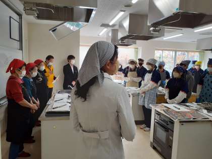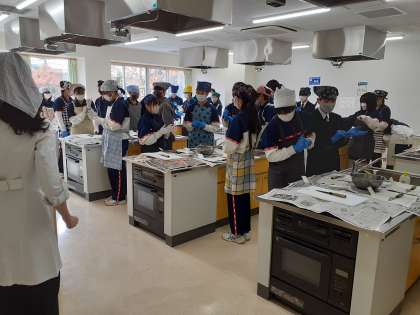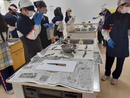 「浜のかあさんと語ろう会」では、座学の授業と調理実習が交互に組み込まれています。調理室では、まずは八丈島のお話を伺い、ムロアジをさばきます。