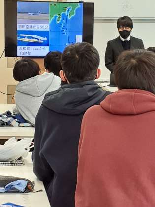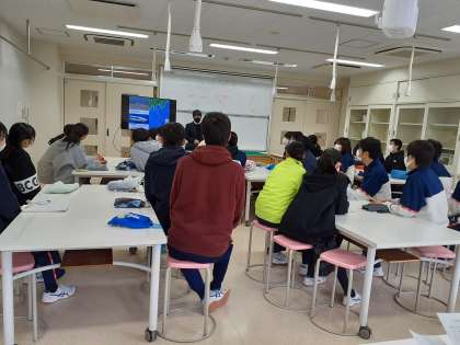 となりの被服室では、八丈島の役所の方に八丈島のお話を伺います。今回は、漁協のお母さん達と共に来校してくれました。
