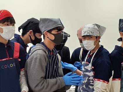 飛び魚を観察した後、今日これから一人一人がさばくことになるムロアジを見せてもらっています。