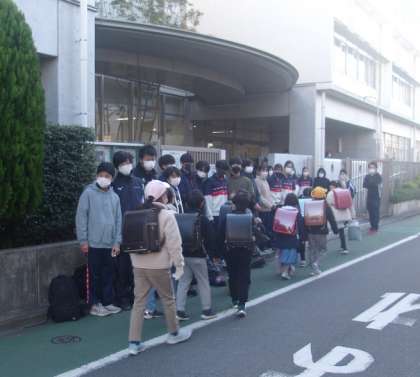 写真は、桜町小学校の正門でのあいさつの様子です。久しぶりに小学校を訪れ懐かしさを感じたようです。「青門」と2か所に分かれて元気に挨拶をしていました。