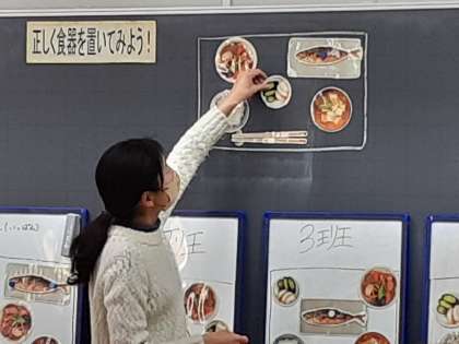 1年生の教室では、先週いっぱいかけて、教科日本語「食育:しつらえ」の授業が行われました。和食の食器の配置、食べる時の箸の運び方などを学びました。