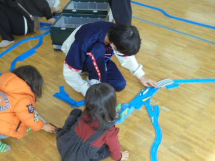 こちらの児童館では、幼児と一緒にプラレールで遊んでいます。いいぇ、遊ばせてあげています。