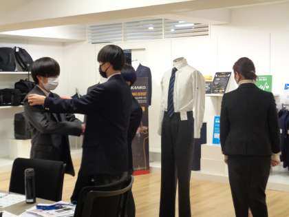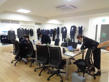 本校の標準服を手掛けてくださっている会社のショールームには、たくさん学校の標準服が並んでいます。深中の新しい標準服は、さらに動きやすくすっきりとしたデザインになっています。