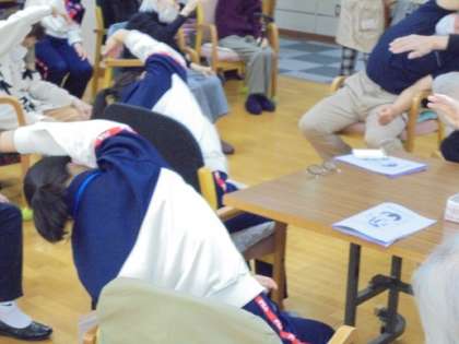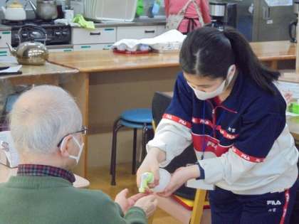 高齢者の方との交流が、地域の連携に繋がると良いですね。一緒に体操をしたり、手の消毒をしたり。会話も弾んだことでしょう。
