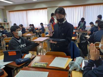 1年生の教室では、ビブリオバトルがくりひろげられていました。自分の好きな本を紹介するのですから、気合いが入ります。