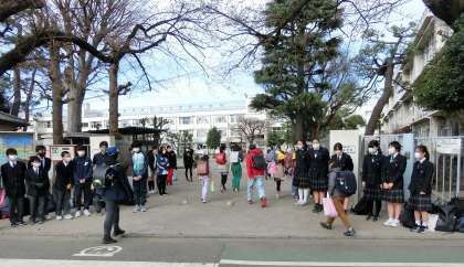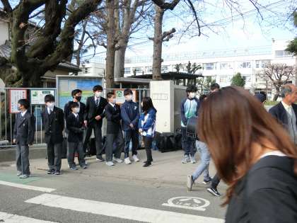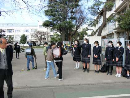 3月14日(火)の登校時間帯に1年生が出身小学校を訪れ、正門前で挨拶運動を行いました。小学生と挨拶を交わす姿を見ると大きく成長したことを改めて感じさせます。在学中にお世話になった教職員の方々と旧交も交わしていました。