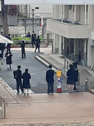 朝方は雨が降っていましたが、式が終わる頃には雨が上がり、晴れ間も見えてきました。受付時間より早く、全ての新入生が確認できました。いよいよ入学式が始まります。