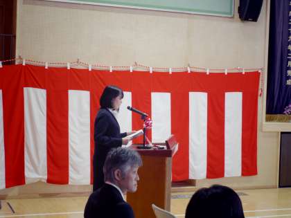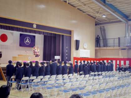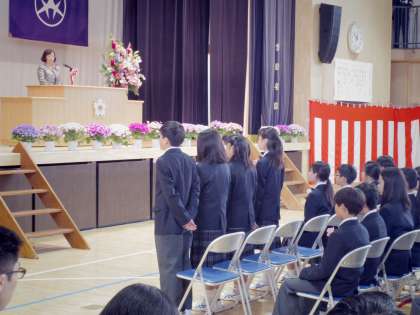 司会による新入生の入場。そして、呼名の様子です。担任の先生からの呼名に元気に起立し、返事を返す1年生の姿は大変立派で感心しました。1組の写真です。