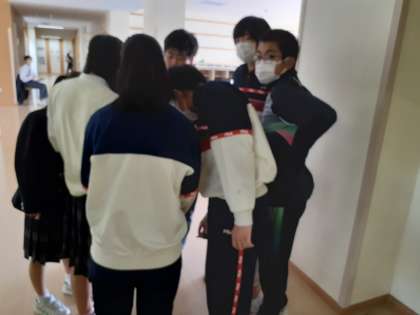 見守る先生も笑顔です。真剣に相談している姿も3学年まとまっています。