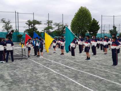 吹奏楽部の演奏で行進し、各色のクラス旗が集まり、選手宣誓となります。