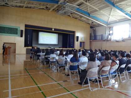 全体会では、1年生への部活動動画を紹介、校長から部活動についての説明が行われました。