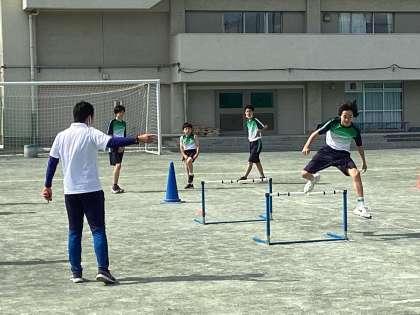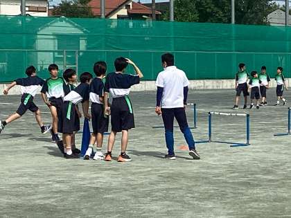 その後、実際に教えられたやり方を真似て、生徒がハードルを飛びます。