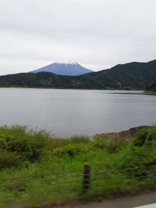 学園に向かう湖畔の道から見える河口湖と富士山。