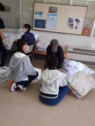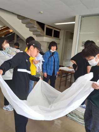 寝具カバーを畳み直しています。大変な作業です。宿舎の小林さんが先生たちと共に、丁寧にご指導くださってます。