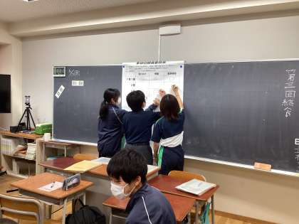 給食委員会では配膳時のマスク着用の呼びかけ、食事を一緒に楽しむためのマナーについて考えました。また、片付け時のビニール袋削減についての意見が出たり、SDGsの意識の高さが窺われました。