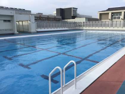 写真は放課後のプールです。静かな水面ですが、日中は生徒の声と笛の音が響いてきました。