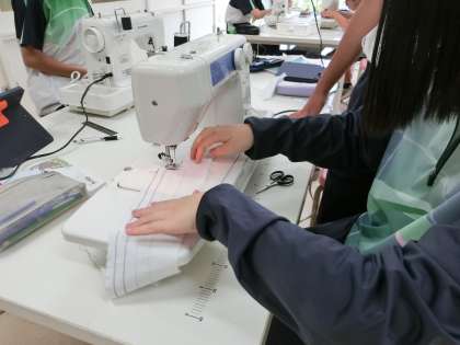 第2学年家庭科では裁縫に挑戦しています。ミシンを操作する練習で布に引かれた線に沿って縫い上げています。