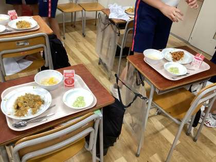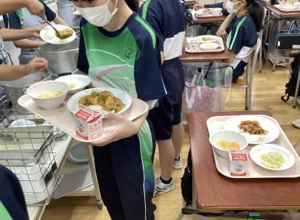 一学期最後の給食は、カレーライスと豚キムチ丼のどちらかを予約するリザーブ給食でした。カレーを選んだ人と豚キムチを選んだ人の割合は、2:1位でした。個付けの料理ではなかったので、お代わりをして両方の味を楽しむ人もいました。