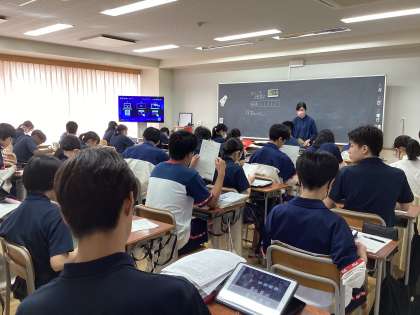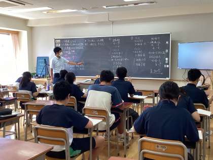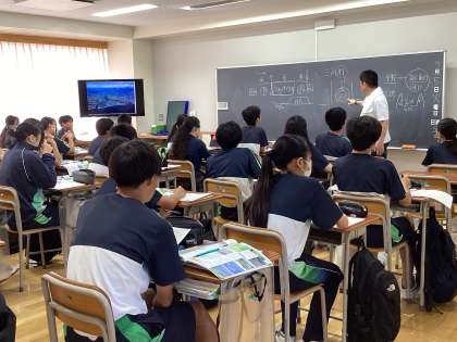 右の写真は1年数学です。1次関数についてです。深沢先生が基本を説明しています。