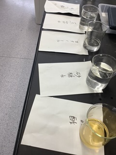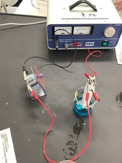 3年生の理科の授業の様子です。「水溶液とイオン」の内容で、水溶液に電流が流れるかを調べる実験です。安全のためにゴーグルをつけて、色々な水溶液で電流の流れを調べています。写真の青い水溶液は塩化銅で、プロペラがクルクル回っています。