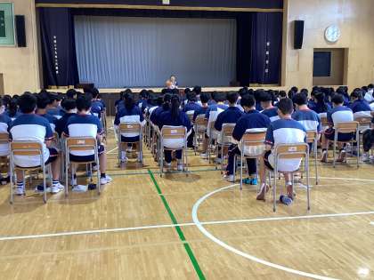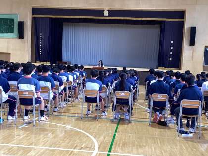 今日は、全体の会が行われ、校長先生からのお話や、係長生徒からの説明!
