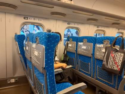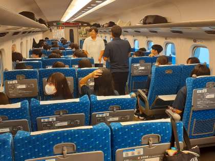 修学旅行専用の新幹線に乗り込んだ様子です。和やかに会話を楽しんでます。