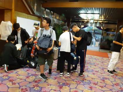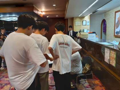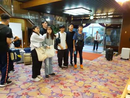予定通りに京都のお宿、石長松菊園で、到着チェックを受けている班、破損チェック表を提出している班、部屋に荷物を運ぶ班がいます。