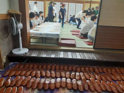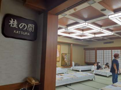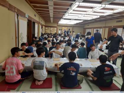 部屋で美味しいすき焼きを食べ終えたら、大広間で「和本づくり」の体験学習を行います。まずは、先生からの説明を聞きます。