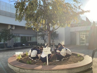 今日は花いっぱい運動を行いました。生徒会本部役員を中心に希望者を募り、中庭の花壇にチューリップやアイフェイオンの球根を植えました。早春に花が咲くのが楽しみです。
