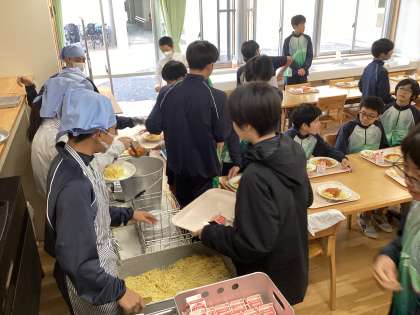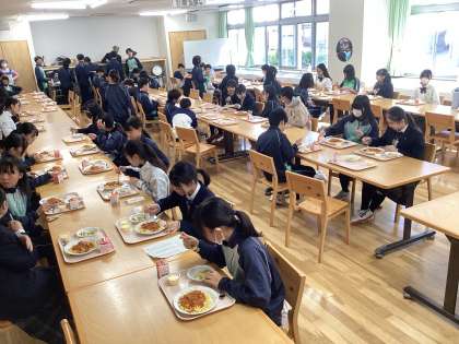 1年1組と1年2組合同でランチルーム給食を行いました。いつもと違う環境での給食で、恥ずかしそうにもしていましたが、楽しそうに給食を食べていました。