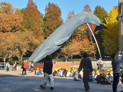写真は、紅葉を背景にした科学博物館のクジラです。