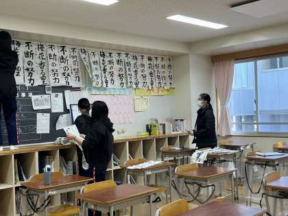各クラスの国語係が書き初めを展示してくれました。クラスメイトの大切な作品を高い所に掲示するのは大変な作業です。校内書き初め展を経て、8作品が来週開催される区の展覧会に出品されます。